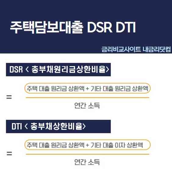- DSR(Debt Service Ratio): 대출자의 총 소득 대비 총 부채 상환액의 비율로, DSR이 낮을수록 대출 한도가 높아집니다.